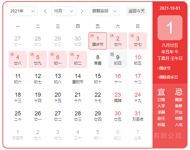 根据国务办国庆放假通知精神,并结合公司实际情况,经研究决定,2021年国庆节放假安排如下:
