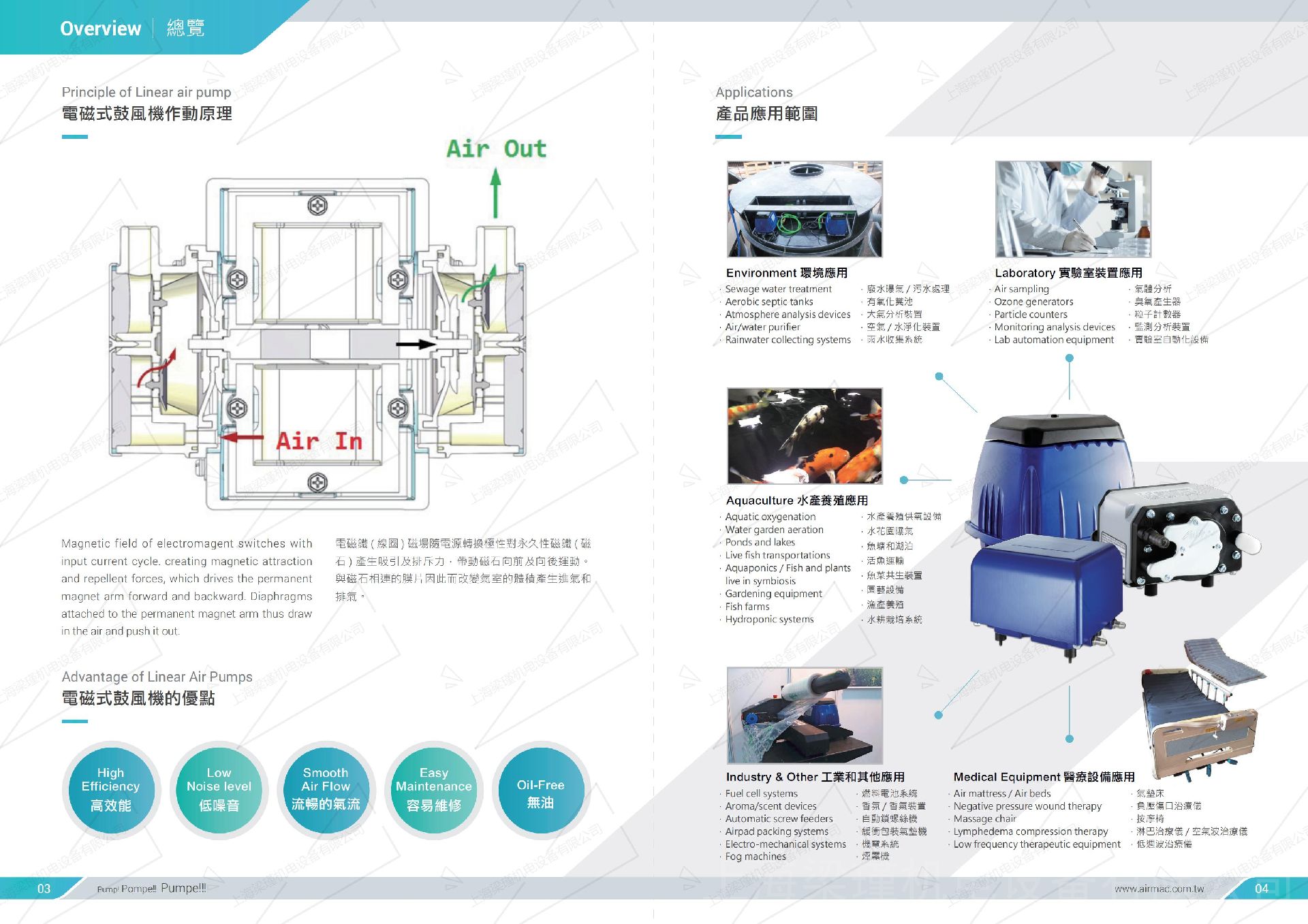 7、电磁式空气泵配有保护装置,即温度过载保护,以保护与降低产品因短时间不当使用条件而可能造成的产品毁损,可实时的停止产品的持续运作,以降低维修与零件更换的成本。 应用范围:废水处理(净化槽,移动厕所,曝气机);小型污水处理;医疗实验室污水处理;农村一体化污水处理设备等。