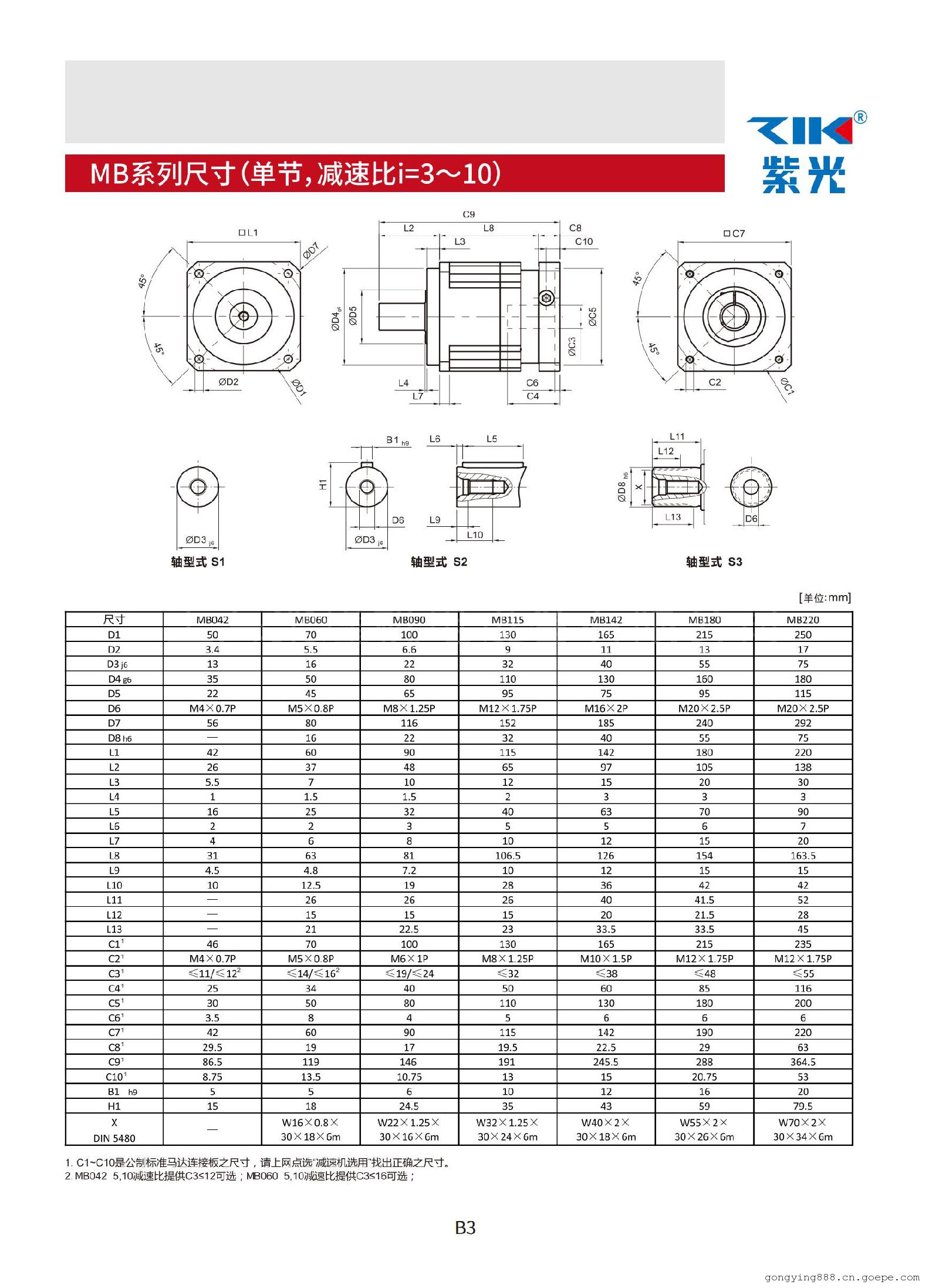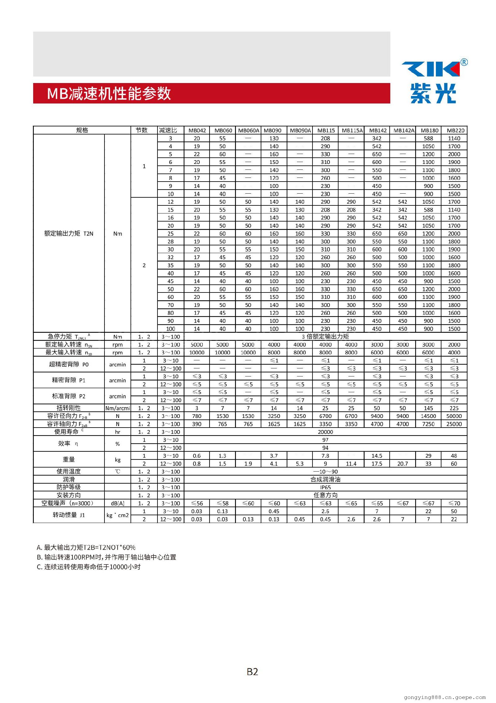 级数:行星齿轮的套数。由于一套行星齿轮无法满足较大的传动比,有时需要2套或者3套来满足用户较大的传动比的要求.由于增加了行星齿轮的数量,所以2级或3级减速机的长度会有所增加,效率会有所下降。回程间隙:将输出端固定,输入端顺时针和逆时针方向旋转,使输入端产生额定扭矩+-2%扭矩时,减速机输入端有一个微小的角位移,此角位移就是回程间隙.单位是"分",就是一度的六十分之一.也有人称之为背隙。行星减速机是一种工业产品,行星减速机是一种传达机构,其结构由一个内齿环紧密结合於齿箱壳体上,环齿中心有一个自外部动力所驱动之太阳齿轮,介於两者之间有一组由三颗齿轮等分组合於托盘上之行星齿轮组,该组行星齿轮依靠著出力轴、内齿环及太阳齿支撑浮游於期间;当入力侧动力驱动太阳齿时,可带动行星齿轮自转,并依循著内齿环之轨迹沿著中心公转,行星之旋转带动连结於托盘之出力轴输出动力。利用齿轮的速度转换器,将电机(马达)的回转数减速到所要的回转数,并得到较大转矩的机构。在用于传递动力与运动的减速机机构中,行星减速机属精密型减速机,减速比可精确到0.1转-0.5转/分钟。